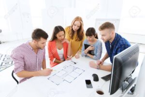 business, startup, architecture and people concept – creative architect team or students with blueprint working at office B.Arch & M.Plan students